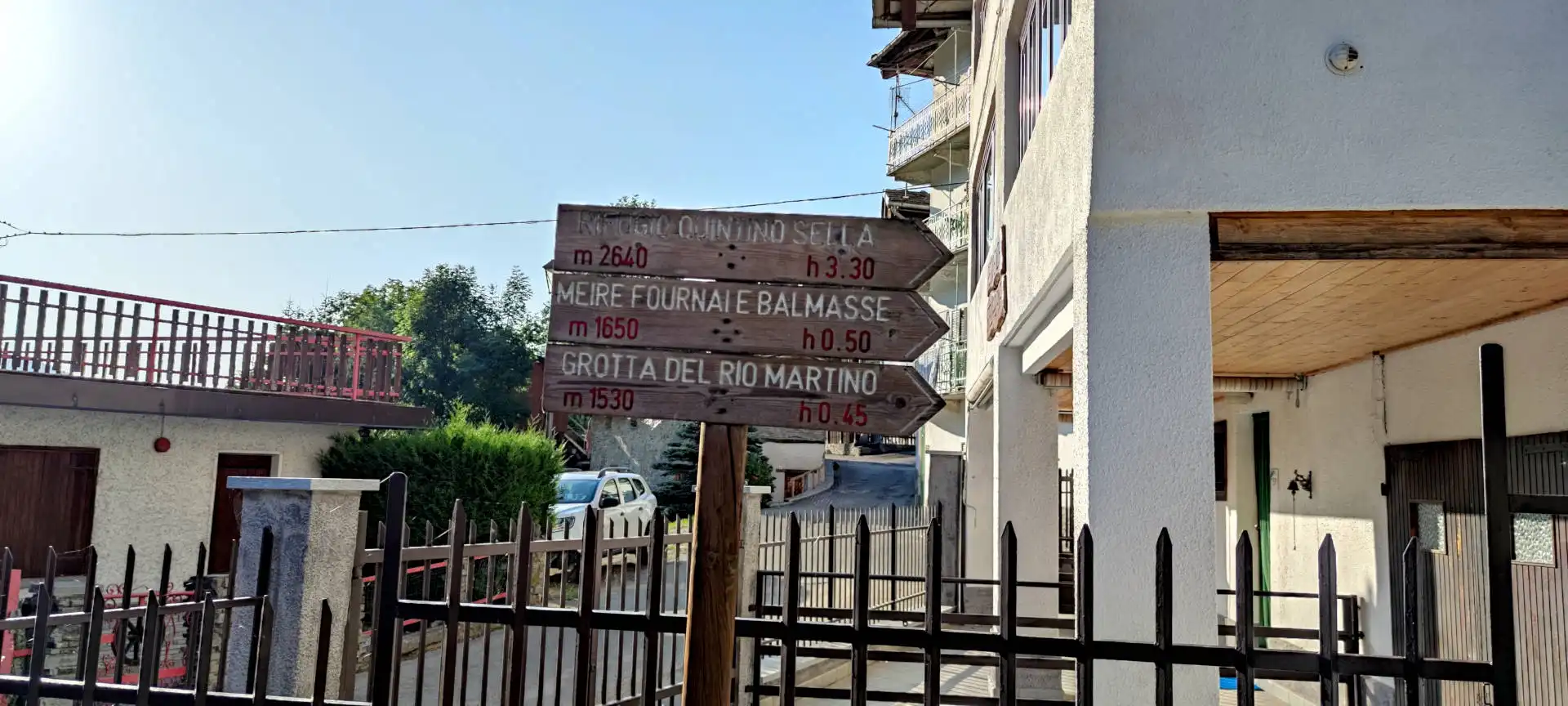 Dopo aver superato una prima parete piuttosto ripida, incrociamo il sentiero che porta al Rifugio Aquila Nera, situato all'arrivo della seggiovia. Lo seguiamo per un breve tratto, fino a raggiungere Meire Fournai, a quota 1550 metri, che superiamo per raggiungere la successiva Meire Balmasse, circa 100 metri più in alto.