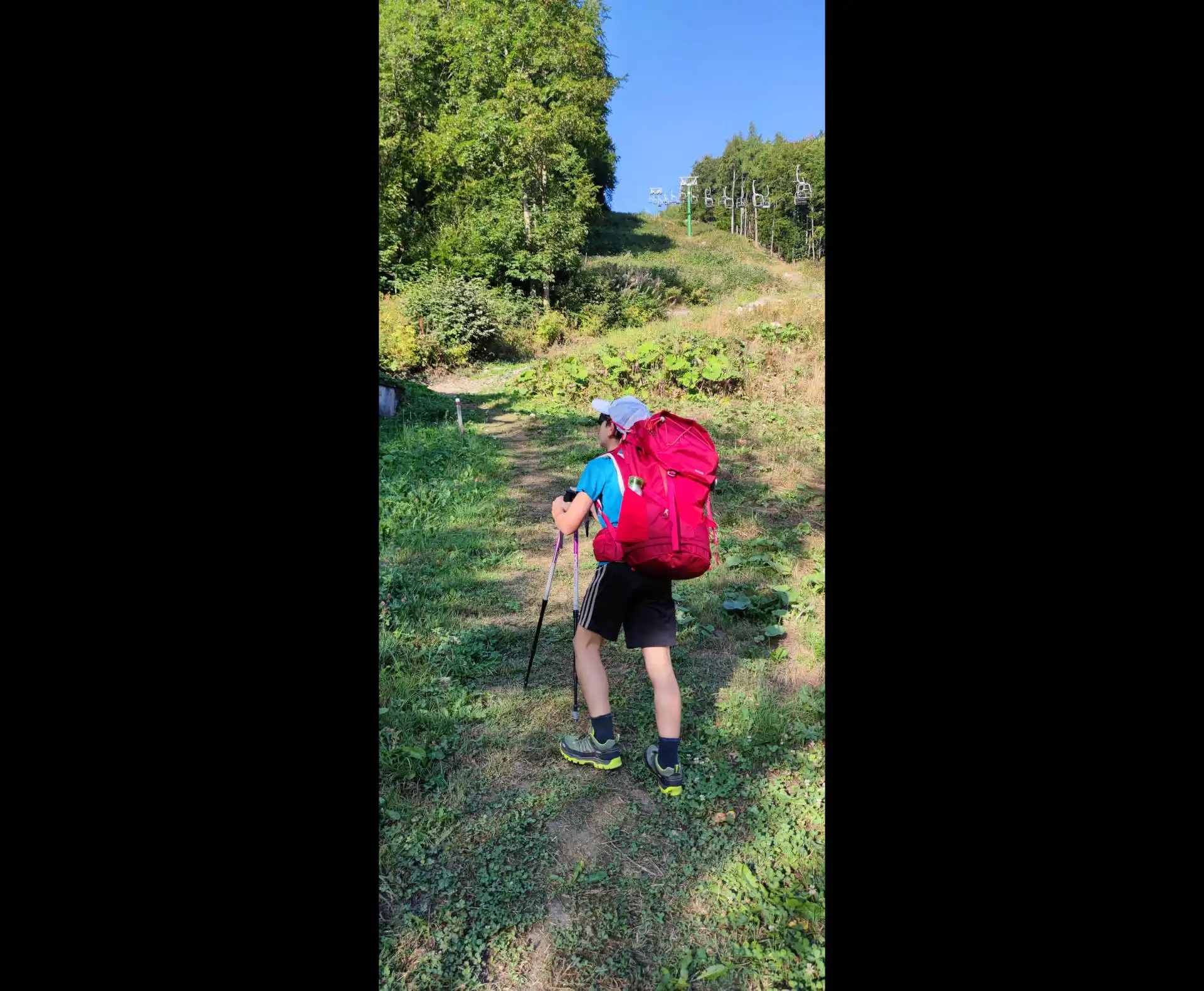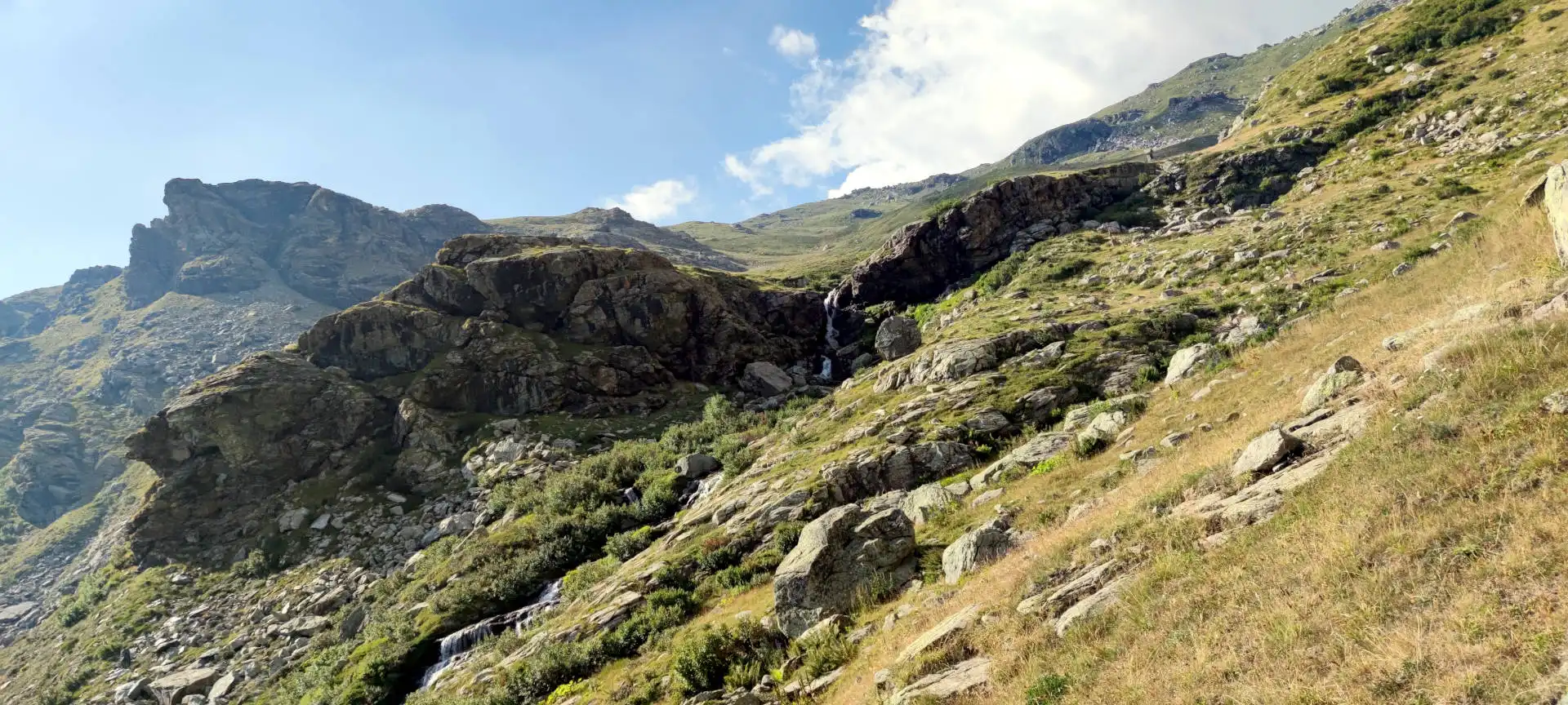 Da questo punto la salita si fa più dolce e il paesaggio inizia a trasformarsi. Gli alberi si diradano, lasciando spazio a prati d'alta quota e scorci sempre più ampi sulla valle. Il cielo è limpido, e il sole illumina ogni cosa con una luce calda e vibrante. Ci fermiamo spesso, non tanto per riposare, quanto per goderci appieno quei panorami che sembrano aprirsi passo dopo passo, regalandoci un senso di libertà difficile da descrivere.