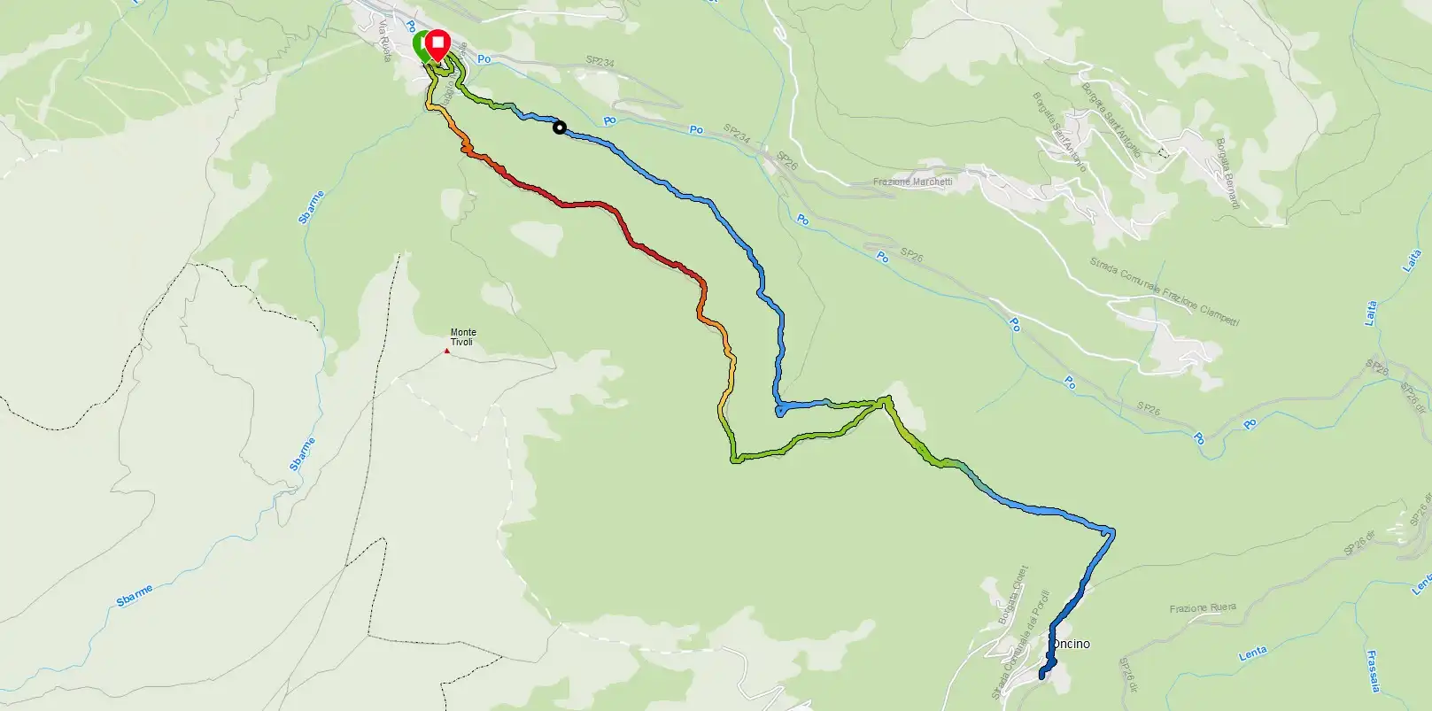 Il percorso parte da Crissolo (1300 m), seguendo inizialmente il sentiero per il Monte Tivoli e poi la deviazione verso Oncino. La camminata si svolge quasi tutta nel bosco, fino a raggiungere San Giacomo e la suggestiva panchina gigante, da cui si apre un panorama mozzafiato sulla valle.